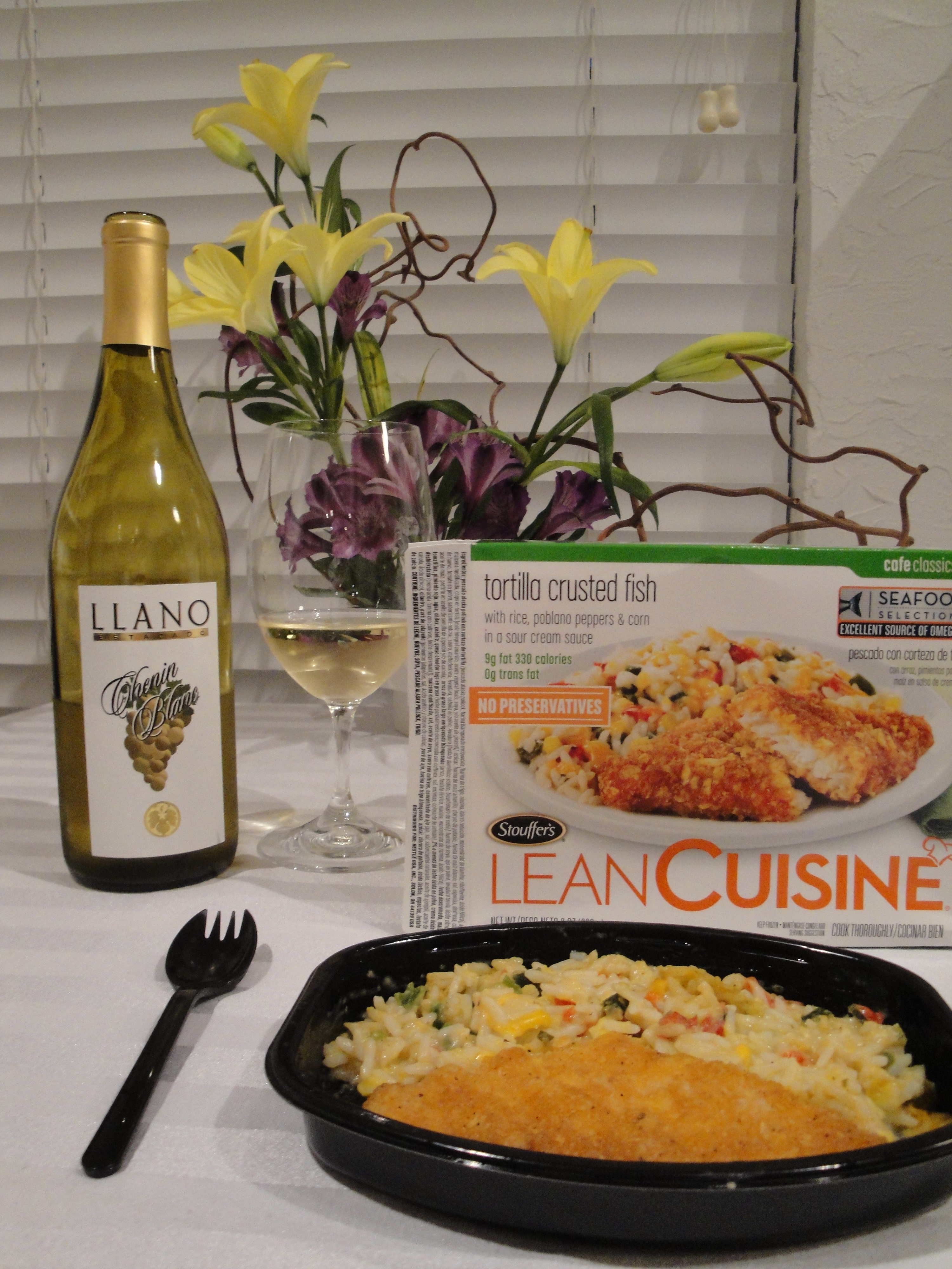 Tonight’s Sporkable Fare is Lean Cuisine Tortilla Crusted Fish with rice, poblano peppers & corn in a sour cream sauce. The wine is Llano Estacado Chenin Blanc. All was bought at Kroger and the wine was less than $7. By the way, I mentioned this same wine in my Texas Section under the “38 Wineries in 90 Minutes”. I really like this wine, even thought it is slightly sweeter than a traditional Chenin Blanc. It has a clean finish and a wonderful pear and apple taste with a little bit of honeysuckle; that’s where the sweetness comes in.